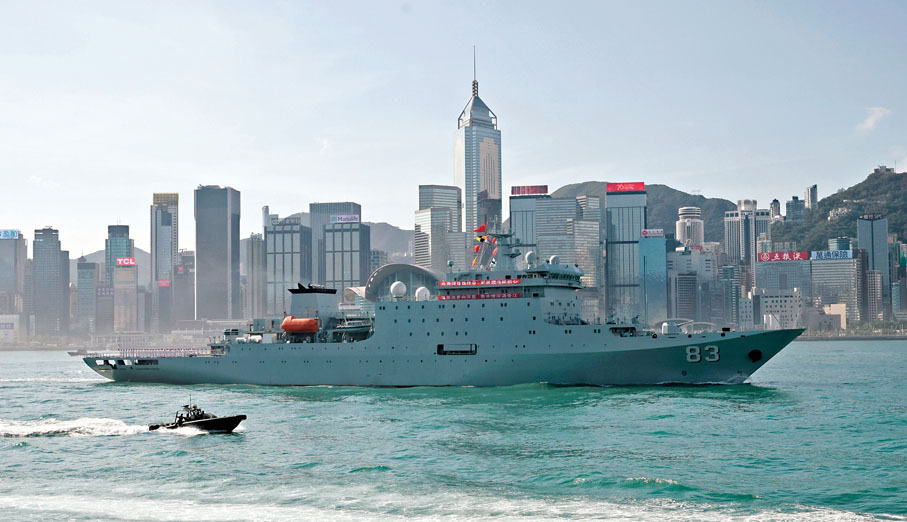 戚繼光艦和沂蒙山艦昨日在香港特區政府船隊和駐香港部隊艦艇伴航下進入香港附近水域。戚繼光艦懸掛醒目的橫幅:「向海圖強擔使命 愛民護港踐初心」及「強軍逐夢向深藍 魚水情深滿香江」;沂蒙山艦則懸掛「人民海軍忠於黨 艦行萬里不迷航」、「鐵血忠心衛海疆 深藍萬里守安瀾」及「共築中國夢 同敘魚水情」橫幅,展現了海軍將士的使命擔當。