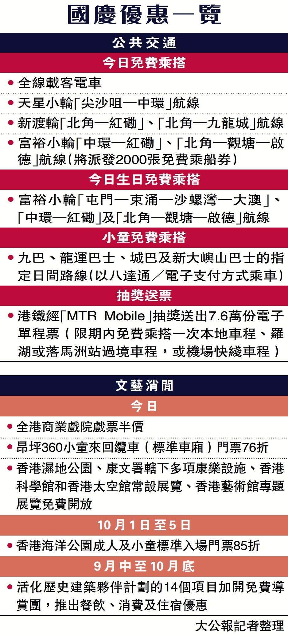 國慶與中秋黃金周期間,本港慶祝活動多籮籮,今日沙田馬場舉行國慶賽馬日,市民可免費進入沙田及跑馬地馬場公眾席,持有效來港旅遊證件或護照的旅客進場後,到訪「遊客專區」即可免費參觀「360體驗區」,沙田馬場「百勝廳」及「駿星匯」推出指定套餐七六折優惠。全港逾百個商場及百貨公司推出多項優惠禮遇。全港約3000間食肆和商戶推出國慶餐飲優惠,包括餐廳堂食可享全單七折、買一送一、折扣價購買指定套餐等。多項公共交通工具提供票價優惠。