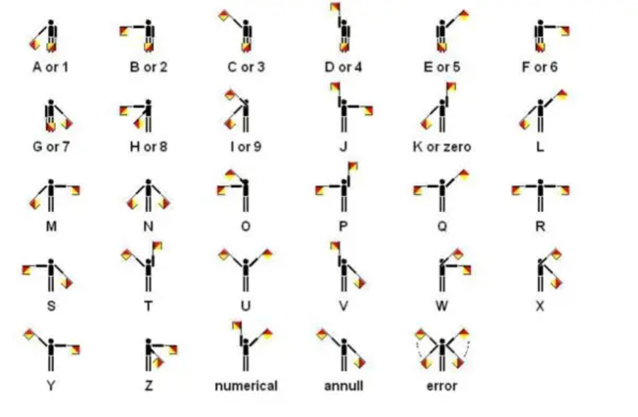 下圖為全套航海手旗旗語所代表的26個英文字母和0-9的數目字及26個字母所代表的含義。最後三個旗語分別表示「現在發布的是數字旗語」、「取消剛才的信號」、「錯誤旗語」。