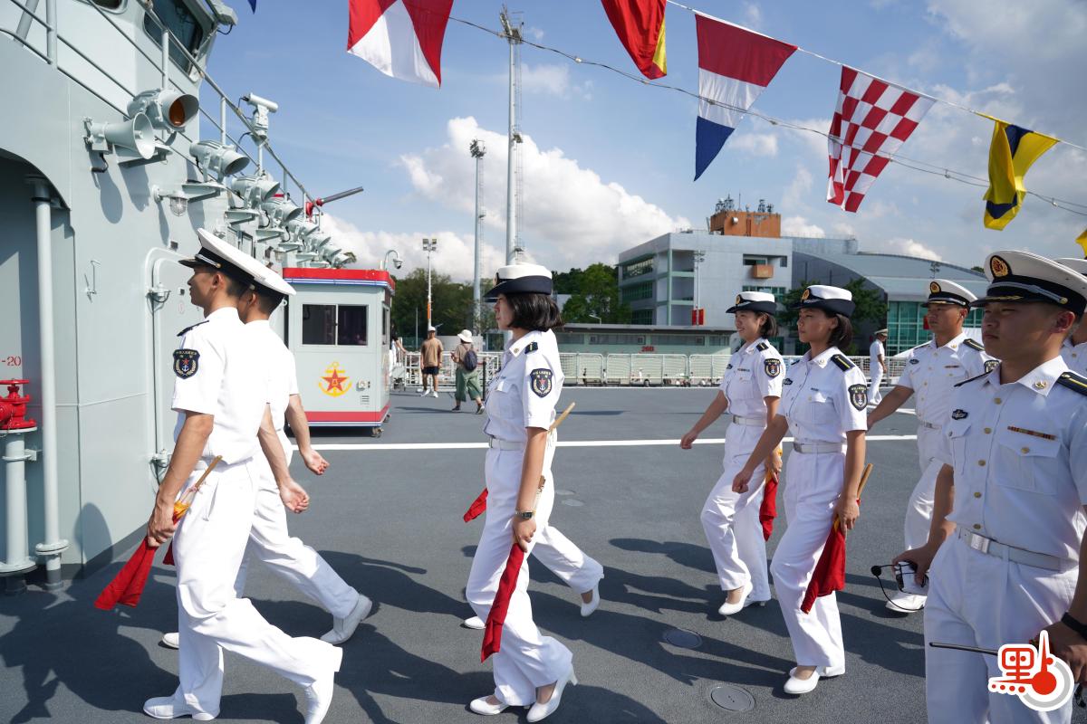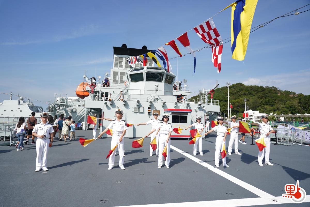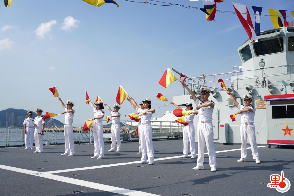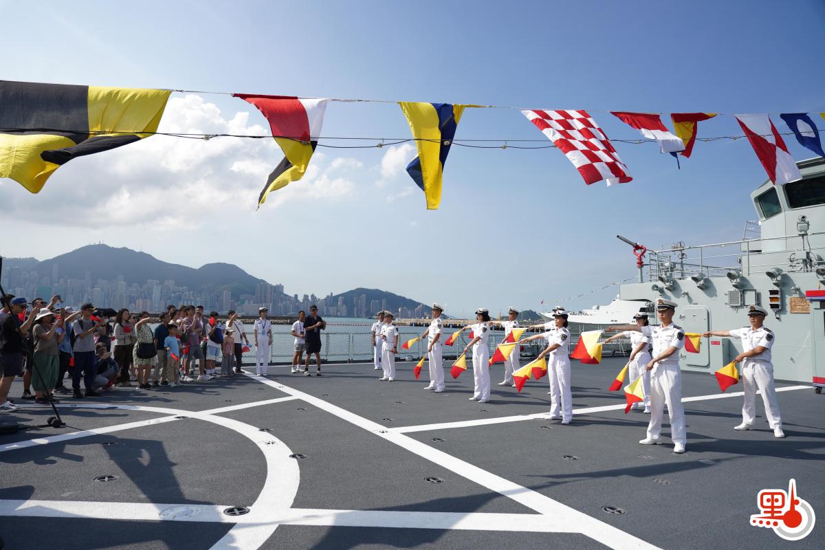 【點新聞報道】由海軍戚繼光艦、沂蒙山艦組成的83艦編隊,搭載1200餘名海軍學員和官兵,9月26日分別從大連某軍港和某民用港口解纜起航。今日是中華人民共和國成立76周年紀念日,軍艦在昂船洲軍營舉行艦艇開放活動,接受市民登艦參觀。甲板上,海軍學員們向市民展示如何打旗語,並用手旗打出「香港,你好」和「國安,家好」的旗語向香港同胞問好。