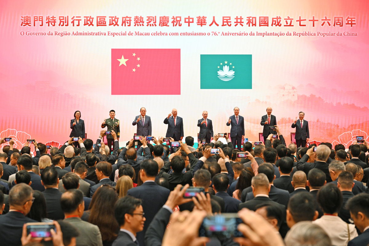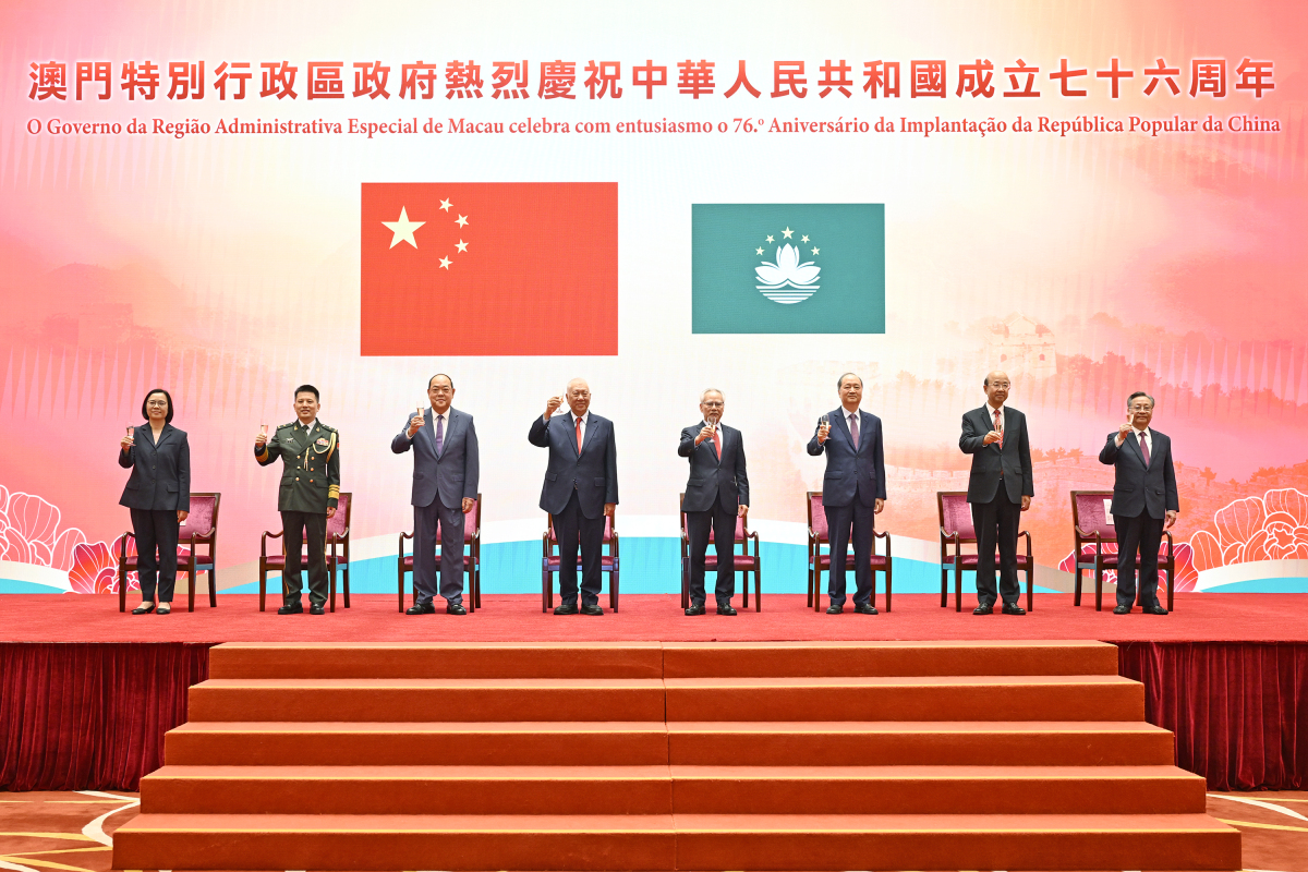 【點新聞報道】澳門特區政府今日(10月1日)舉行酒會,慶祝中華人民共和國成立76周年,全國政協副主席何厚鏵、澳門行政長官岑浩輝、中央人民政府駐澳門特區聯絡辦公室主任鄭新聰、前任行政長官賀一誠、外交部駐澳門特派員公署特派員劉顯法、解放軍駐澳部隊政治委員林慶華、立法會主席高開賢、終審法院院長宋敏莉、行政會委員、立法會議員、特區政府官員、澳區人大代表、政協委員及各界人士等約1320人出席。