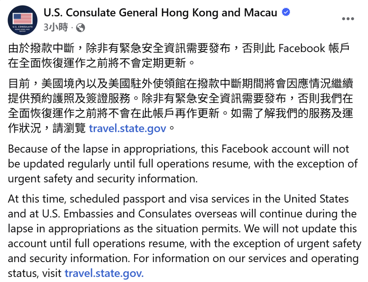 美國駐港澳總領事館又指,由於撥款中斷,除非有緊急安全資訊需要發布,否則社交平台賬戶在全面恢復運作之前將不會定期更新。