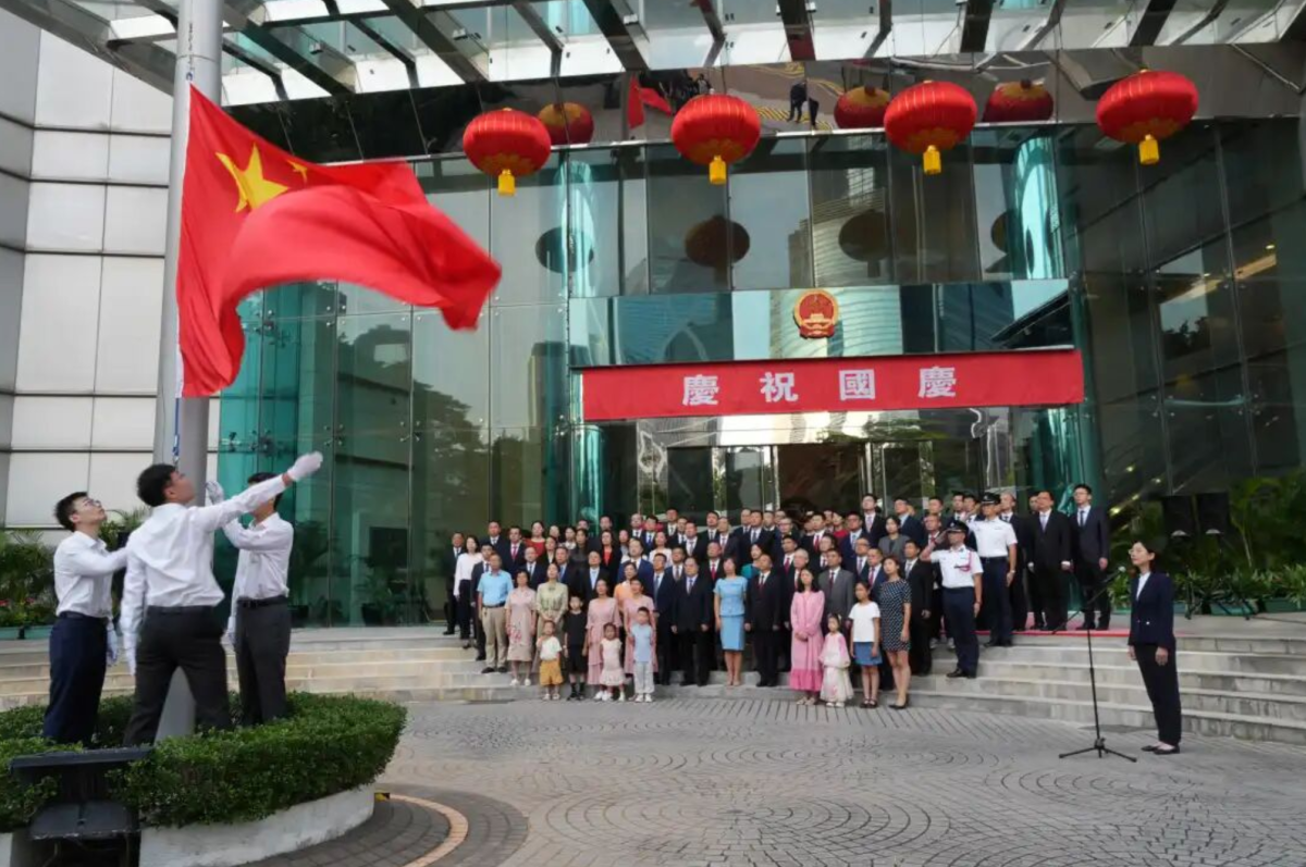 外交部駐港公署表示,76年來,中國特色社會主義建設取得舉世矚目的偉大成就,強國建設、民族復興偉業邁入新的歷史階段。新時代新征程是充滿光榮和夢想的遠征,公署全體同志將牢記黨中央囑託,高擎忠誠旗幟,全面貫徹習近平新時代中國特色社會主義思想,踔厲奮發,砥礪前行,不斷開創涉港外交新局面,為「一國兩制」實踐行穩致遠營造更加良好環境,為中國特色大國外交做出新的更大貢獻。