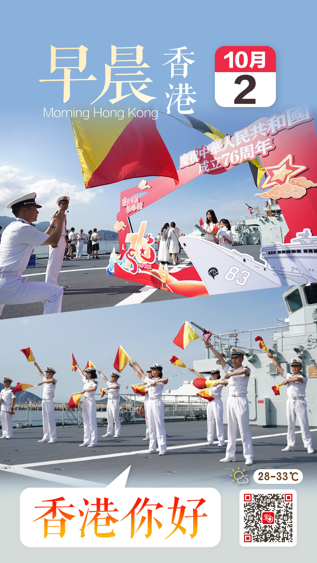 【點新聞報道】由海軍戚繼光艦、沂蒙山艦組成的83艦編隊,搭載1200餘名海軍學員和官兵,於9月30日抵達香港,昨日(10月1日)及今日(10月2日)在昂船洲軍營舉行艦艇開放活動,接受市民登艦參觀。