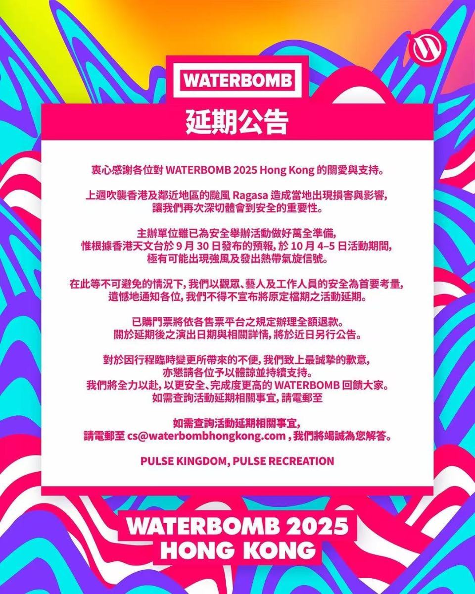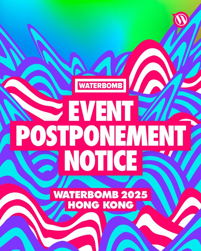 【點新聞報道】户外潑水音樂節WATERBOMB原定本周末一連兩日(4日及5日)在中環海濱舉行,主辦單位昨晚(10月1日)在社交平台表示,根據天文台發布的預報,本周六及周日極有可能出現強風及發出熱帶氣旋信號,考慮到觀眾、藝人及工作人員的安全,決定將活動延期。