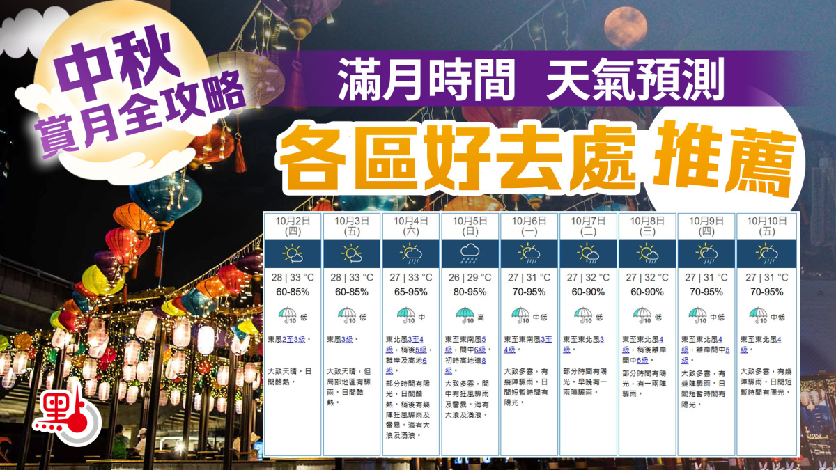 【點新聞報道】2025年的中秋佳節落在10月6日(星期一),許多市民將趁此良辰與親友共聚,一起賞月、品嘗月餅、玩燈籠。想在這人月兩圓的夜晚找到理想去處?今年中秋的天氣是否適合賞月?點新聞為大家整合了中秋賞月全攻略,包括香港各區免費公園、浪漫海濱及特色地點推薦,還有天文台提供的最佳賞月時機,立即查看,計劃你的完美中秋夜!