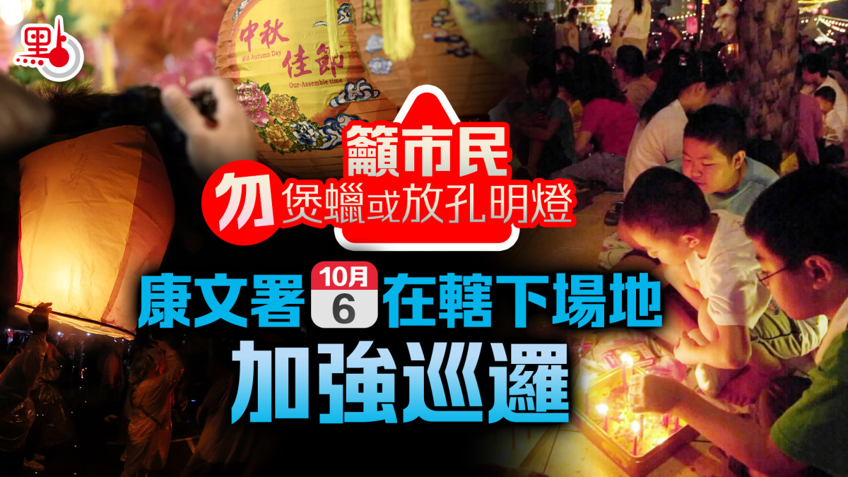 【點新聞報道】康樂及文化事務署今日(10月2日)呼籲市民,在歡度中秋佳節之餘,切勿煲蠟或放孔明燈,並必須保持地方整潔。為確保市民能在安全和衞生的環境慶祝佳節,康文署將會調配人手於10月6日(農曆8月15日)在轄下場地,包括公園、公眾泳灘及燒烤場等加強巡邏,對亂拋垃圾、煲蠟、拋擲物件到樹上或放孔明燈的人士採取執法行動。