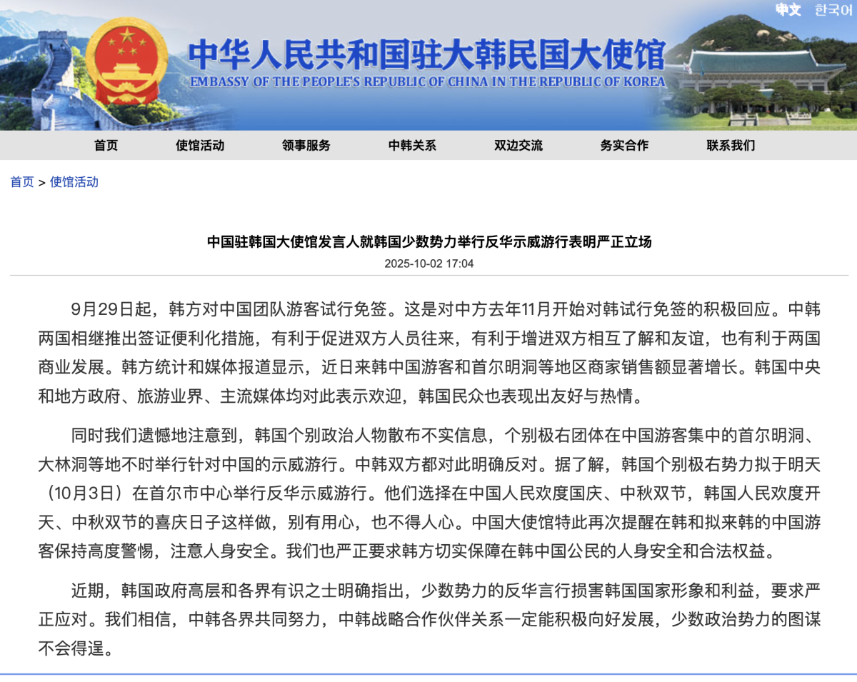 據了解,韓國個別極右勢力擬於明天(10月3日)在首爾市中心舉行反華示威遊行。發言人表示,他們選擇在中國人民歡度國慶、中秋雙節,韓國人民歡度開天、中秋雙節的喜慶日子這樣做,別有用心,也不得人心。中國大使館特此再次提醒在韓和擬來韓的中國遊客保持高度警惕,注意人身安全。我們也嚴正要求韓方切實保障在韓中國公民的人身安全和合法權益。
