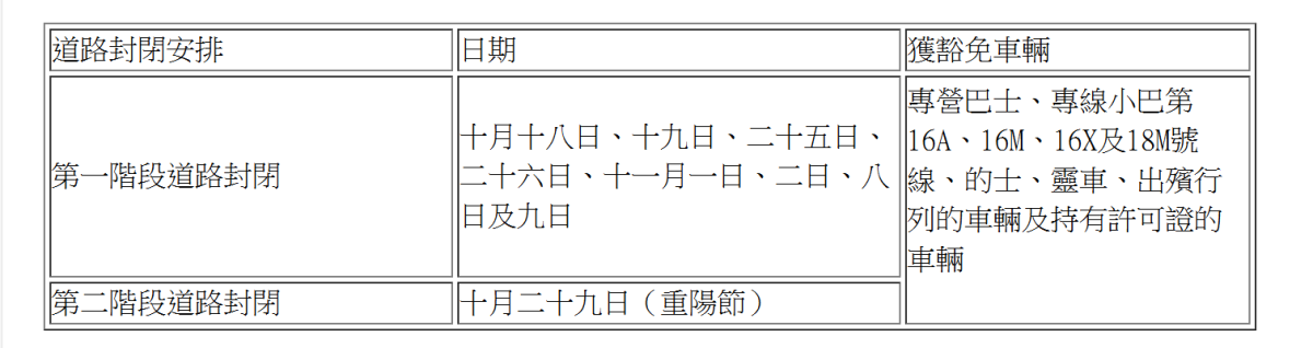 連城道以東的一段歌連臣角道(即由連城道左轉入歌連臣角道前往華人永遠墳場方向)於10月11日至11月16日期間,每日上午7時至下午3時暫劃為私家車及輕型貨車禁區。除持有許可證者外,所有私家車及輕型貨車一律禁止進入該禁區。