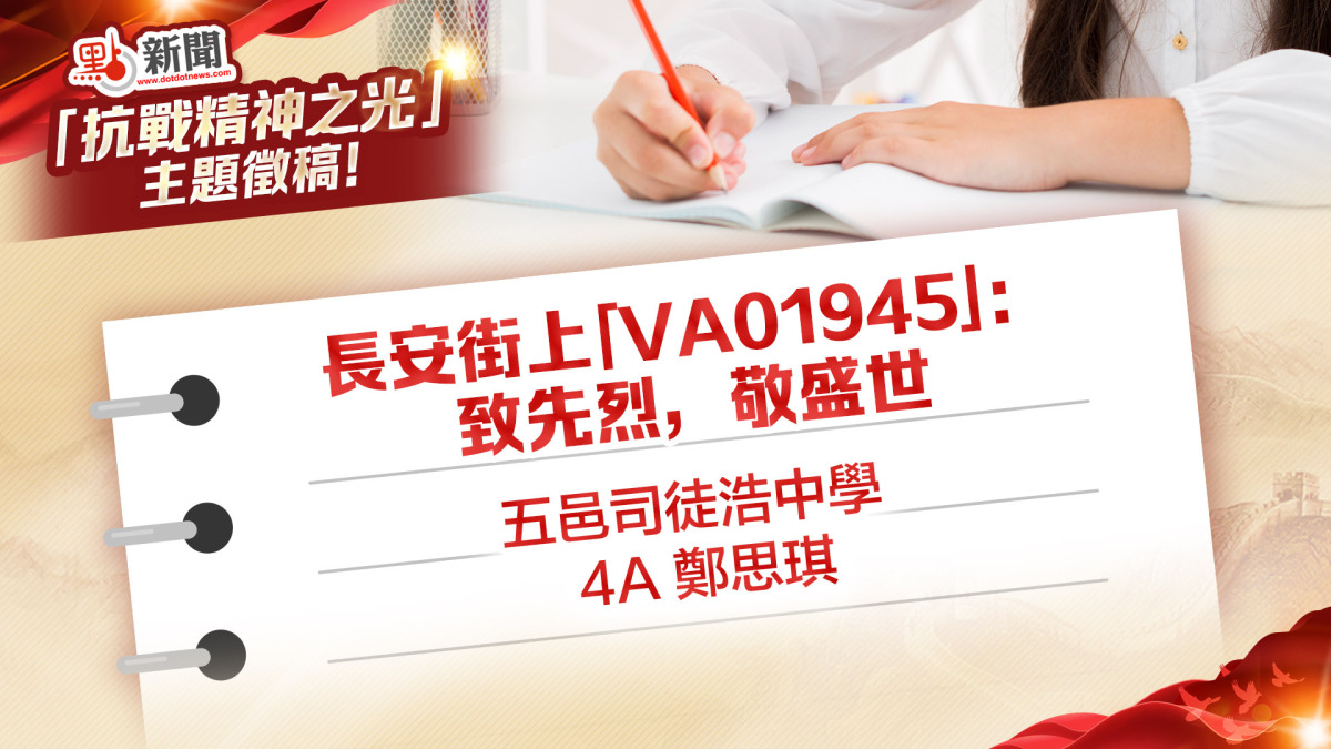 【編者按】今年是中國人民抗日戰爭暨世界反法西斯戰爭勝利80周年,日前恢弘的閱兵儀式,是否也讓你心潮澎湃久久不能平靜?儀式之外,那段深刻入骨的民族苦難與可歌可泣的英雄史詩,更需被永遠銘記與傳承。為此,點新聞「學生園地」早前開啟「抗戰精神之光」主題徵稿,今日刊發的是來自五邑司徒浩中學4A鄭思琪的佳作《長安街上「VA01945」:致先烈,敬盛世》,讓我們一同重溫崢嶸歲月,珍視來之不易的和平。