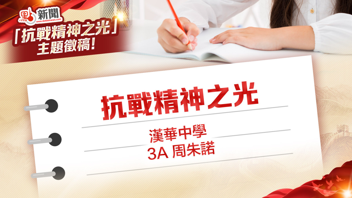 【編者按】今年是中國人民抗日戰爭暨世界反法西斯戰爭勝利80周年,日前恢弘的閱兵儀式,是否也讓你心潮澎湃久久不能平靜?儀式之外,那段深刻入骨的民族苦難與可歌可泣的英雄史詩,更需被永遠銘記與傳承。為此,點新聞「學生園地」早前開啟「抗戰精神之光」主題徵稿,今日刊發的是來自漢華中學3A周朱諾的佳作《抗戰精神之光》,讓我們一同重溫崢嶸歲月,珍視來之不易的和平。