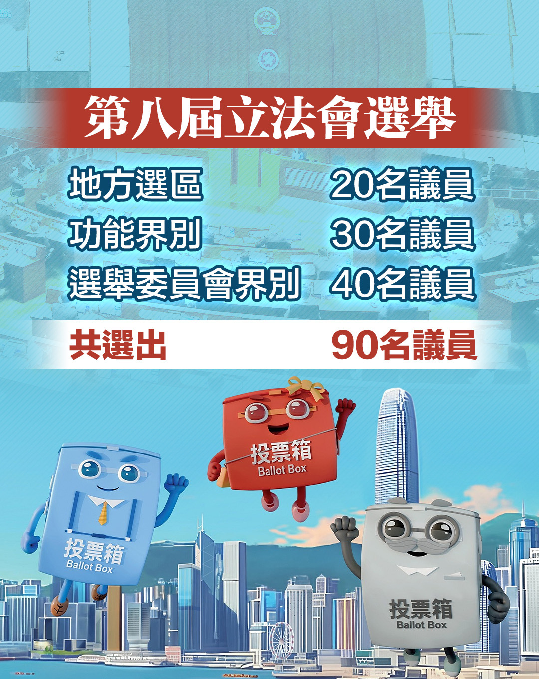 今次換屆選舉在地方選區選出20名議員、功能界別選出30名議員及選舉委員會界別選出40名議員,共選出90名議員。