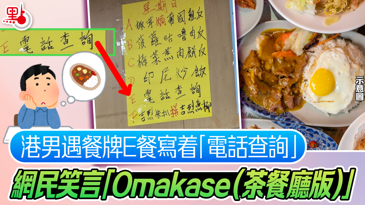 【點新聞報道】近日有港男在社交平台上分享趣事,指一間茶餐廳的餐牌上寫着A至E、5份餐食,但唯獨E餐寫着「電話查詢」,讓人一頭霧水。