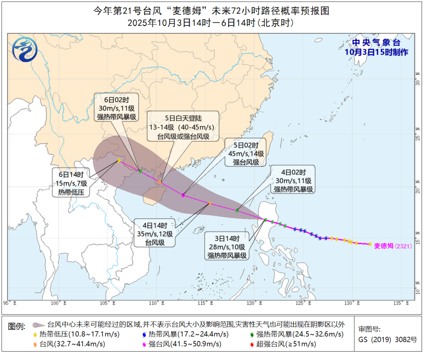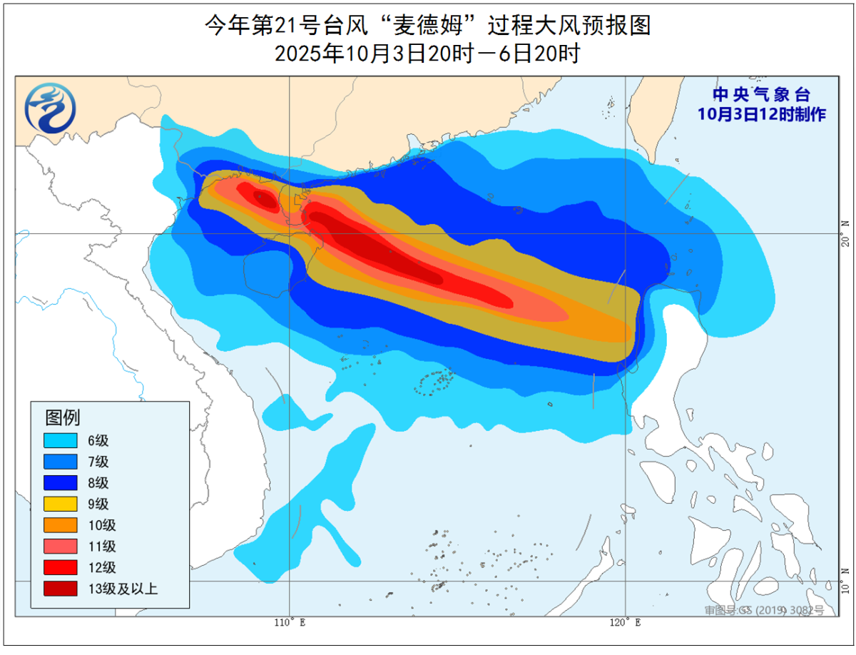 大風預報:3日夜間至6日白天,廣東雷州半島和中西部沿海、廣西沿海、海南島及沿海、西沙群島、中沙群島、黃岩島附近海域將有6至8級風,南海中北部、瓊州海峽、北部灣中北部有9至11級風,「麥德姆」中心經過的附近海域或地區風力可達12至14級、陣風15至17級。