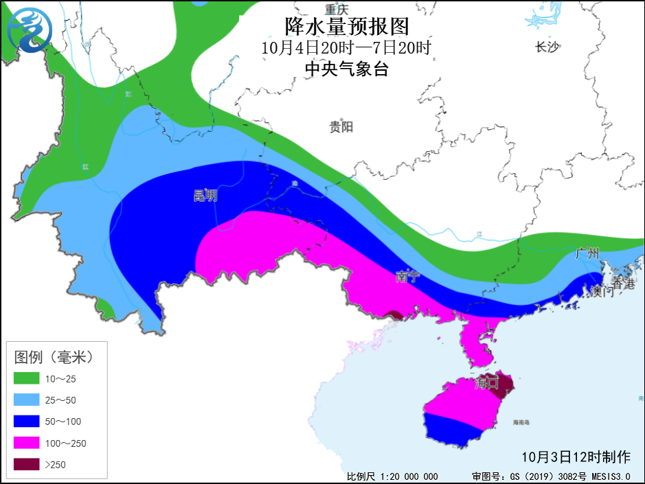 降雨預報:4日夜間至7日白天,華南南部和西部、雲南等地自東向西有大到暴雨;其中,海南島中北部、廣東西南部、廣西南部、雲南東南部部分地區有大暴雨,海南島東北部和廣西沿海局地特大暴雨(累計降雨量100至160毫米,局地250至280毫米)。主要降雨時段廣東、海南4日夜間至5日,廣西5日至6日,雲南6日至7日。