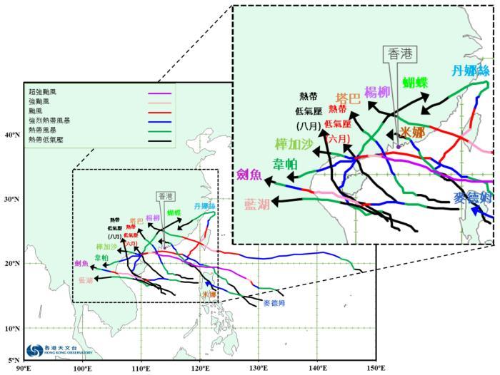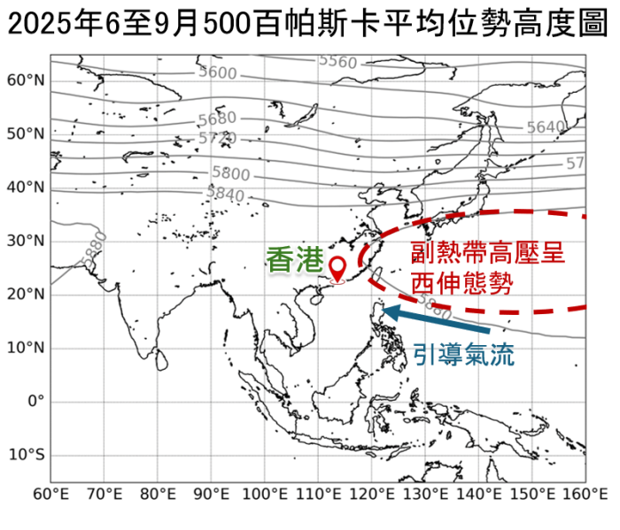 大氣環流:今年6月至9月期間副熱帶高壓脊較多時間呈現偏西伸展的態勢。此配置不但降低了熱帶氣旋於西北太平洋轉向偏北路徑的機會,亦使副熱帶高壓脊南側的東風引導氣流在菲律賓附近海域形成有利的通道,讓在西北太平洋或南海形成的熱帶擾動或熱帶氣旋移向南海北部,提高影響華南沿岸及香港的機會。