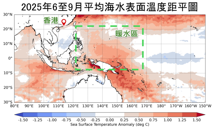 海洋條件:今年6月至9月期間西太平洋海面溫度較正常偏高。尤其是西太平洋暖水區面積較大,廣闊的暖水區提供充足的熱能及較高的大氣不穩定度,促進積雲對流發展,有利熱帶氣旋形成。