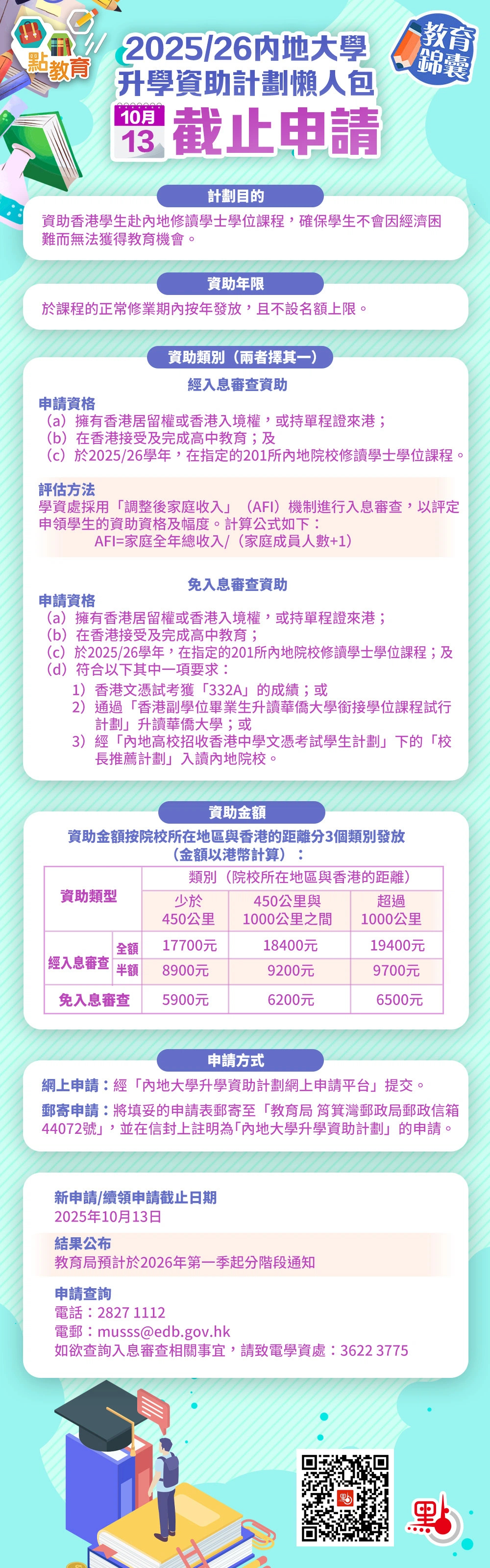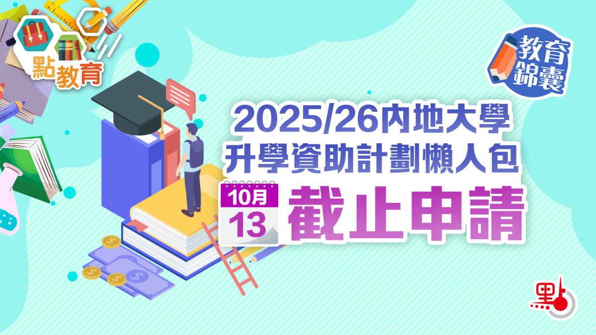 【點新聞報道】為協助赴內地升學且有經濟困難的大學生,教育局現正接受2025/26學年「內地大學升學資助計劃」的申請,該計劃設有「經入息審查資助」及「免入息審查資助」兩大類別,最高資助額達每年19400港元。有意申請者注意,本年度申請將於10月13日截止,趕快行動!