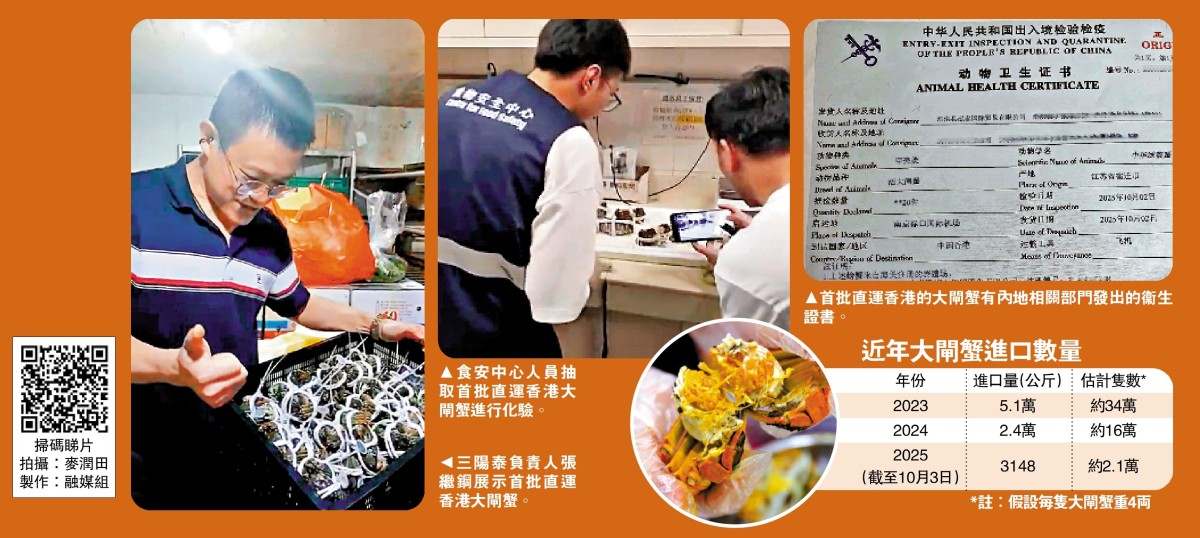 據了解,特區政府與國家海關總署一直就內地大閘蟹供港安排保持溝通。環境及生態局昨晚回覆查詢證實,今年蟹季有大閘蟹已經直接從內地進口至香港,首兩批共300公斤,來自江蘇省,相信內地大閘蟹直接供港將有助縮短運輸所需時間,降低業界的營運成本,並為市民提供更多選擇。特區政府衷心感謝中央政府提供協助,讓進口安排更為暢順。