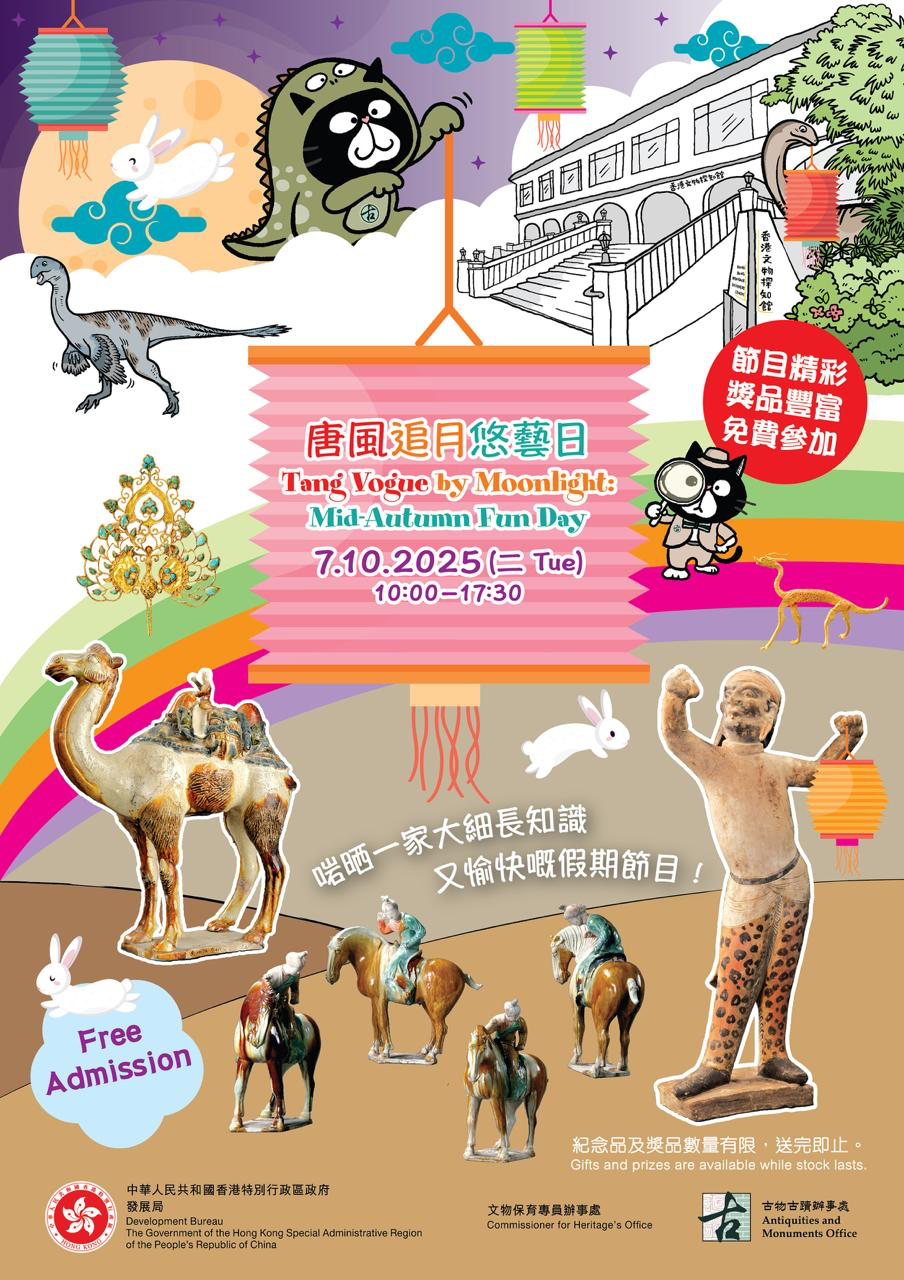 【點新聞報道】發展局古物古蹟辦事處於中秋團圓佳節呈獻「唐風追月悠藝日2025」,與您齊齊追月!參加者完成「唐風萬里:多元交融開放的盛世」展覽、常設展和恐龍會客室展覽的指定任務後,可換領獨一無二的小禮物,在尖沙咀香港文物探知館度過一個難忘的中秋假期吧!精彩節目內容如下: