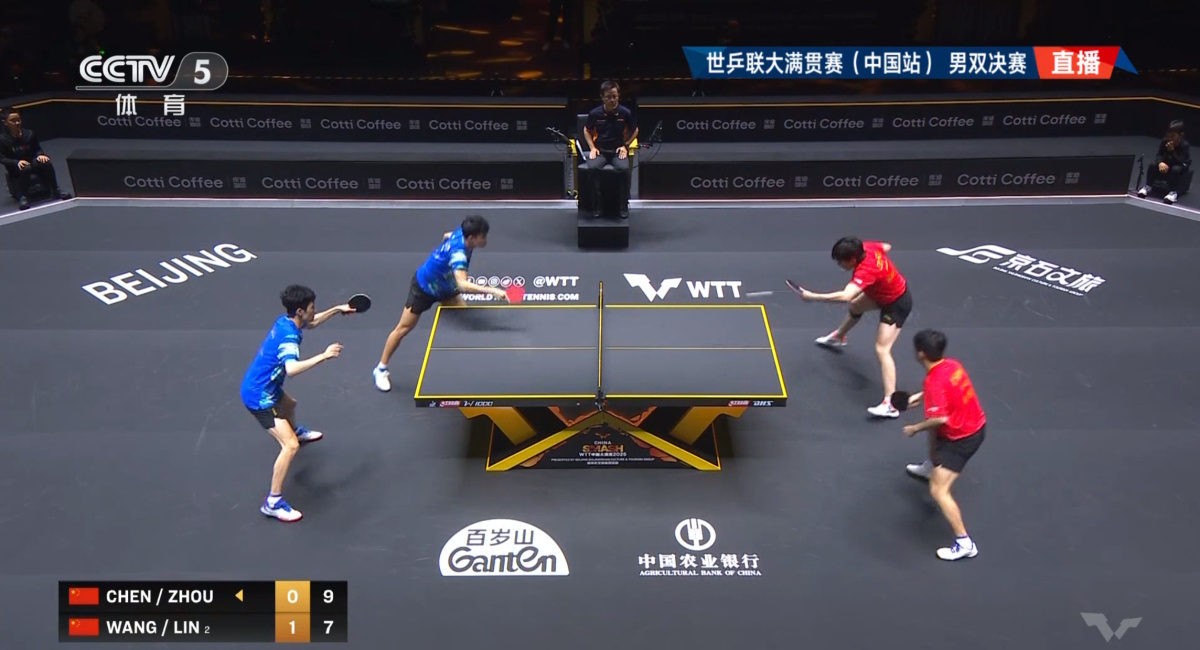 WTT中國大滿貫男雙決賽上演「中國德比」。(央視新聞圖片)