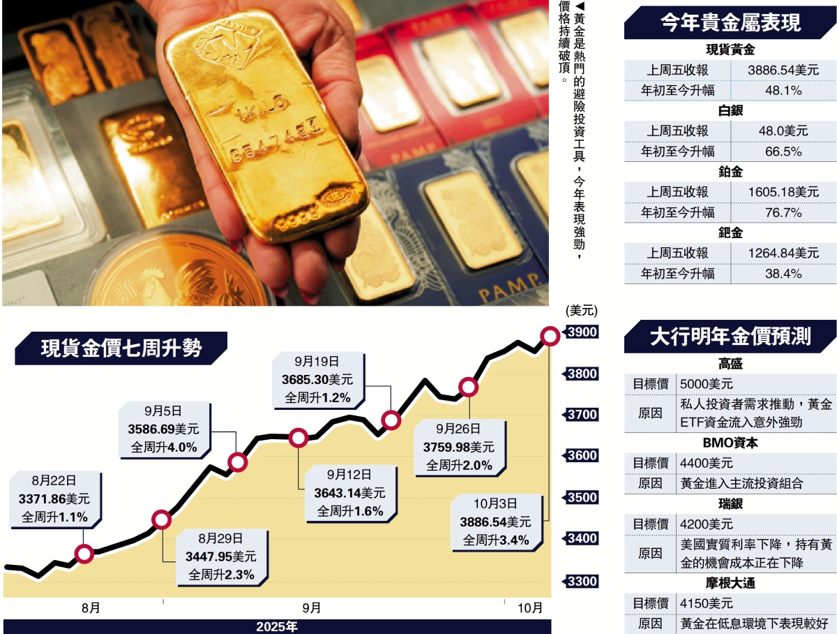 美國共和民主兩黨爭拗不斷,國會參議院否決臨時撥款法案,聯邦政府「停擺」。白宮估計,停擺一周將令美國GDP損失高達150億美元,此壞消息卻成為推高金價的好因素,現貨金上周五報每盎司3886.54美元,持續在歷史高位,全周漲3.4%,連升七周;紐約期金突破3900美元關,收報3908.9美元,同樣連漲七周。