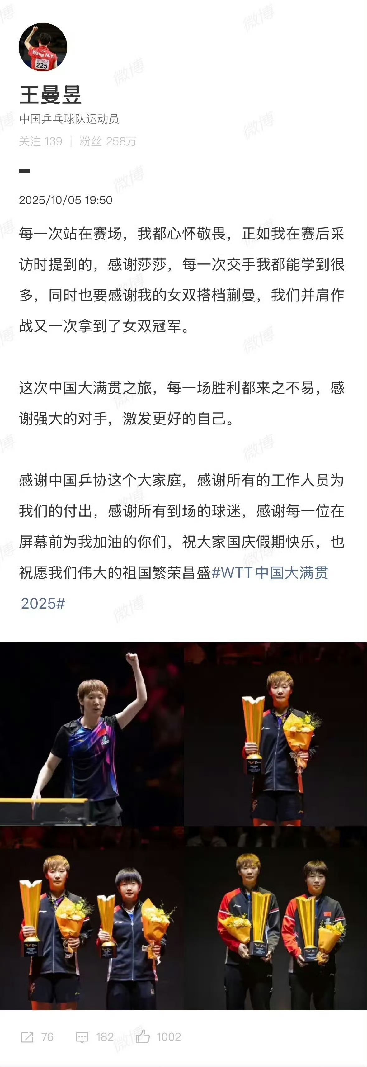 賽後,王曼昱於微博發文:「每一次站在賽場,我都心懷敬畏,正如我在賽後採訪時提到的,感謝莎莎,每一次交手我都能學到很多,同時也要感謝我的女雙搭檔蒯曼,我們並肩作戰又一次拿到了女雙冠軍。這次中國大滿貫之旅,每一場勝利都來之不易,感謝強大的對手,激發更好的自己。 感謝中國乒協這個大家庭,感謝所有的工作人員為我們的付出,感謝所有到場的球迷,感謝每一位在屏幕前為我加油的你們,祝大家國慶假期快樂,也祝願我們偉大的祖國繁榮昌盛。」