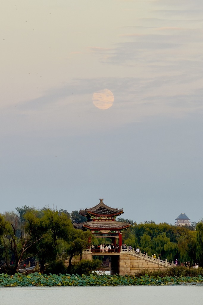 傍晚將至,頤和園練橋之上,一輪圓月已懸在天邊,與夕陽遙相對望。