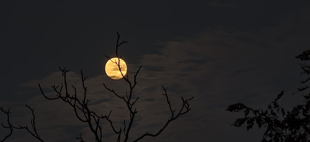 看!這輪中秋明月,並非「小時不識月,呼作白玉盤」的稚氣,而是一輪飽滿、圓潤,帶着些許蜜糖般暖黃色的大月亮。