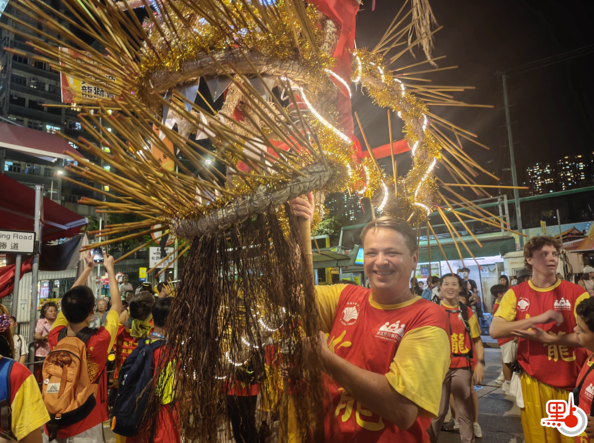 46歲的James住在南丫島、在香港出生長大。他告訴記者,他對舞火龍並不陌生,但真正抓着龍頭帶領隊伍前進還是第一次。他女兒本次是舞龍隊一員,他也因此幸運加入舞龍隊。James激動表示,舞龍的感覺十分奇妙,火龍頭很重,尤其是走到別人面前,當人們想觸摸火龍的時候,有一種「神聖感」油然而生,覺得自己「責任重大」。