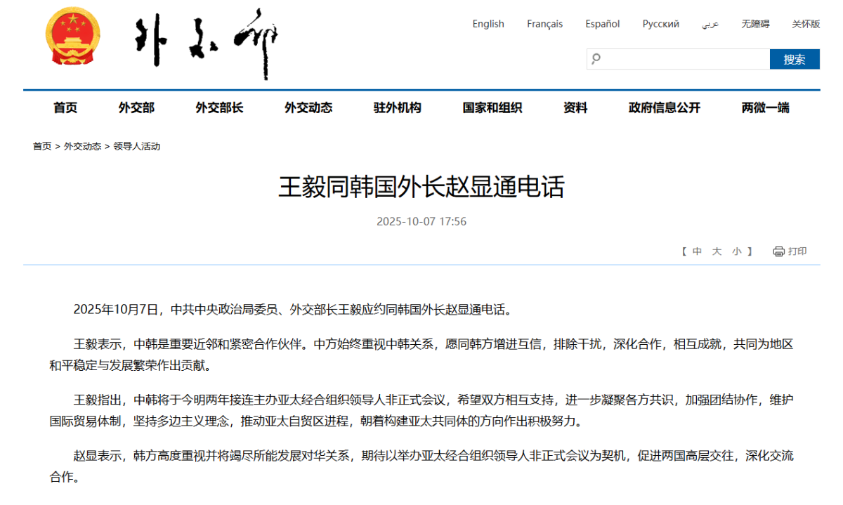 【點新聞報道】10月7日,中共中央政治局委員、外交部長王毅應約同韓國外長趙顯通電話。