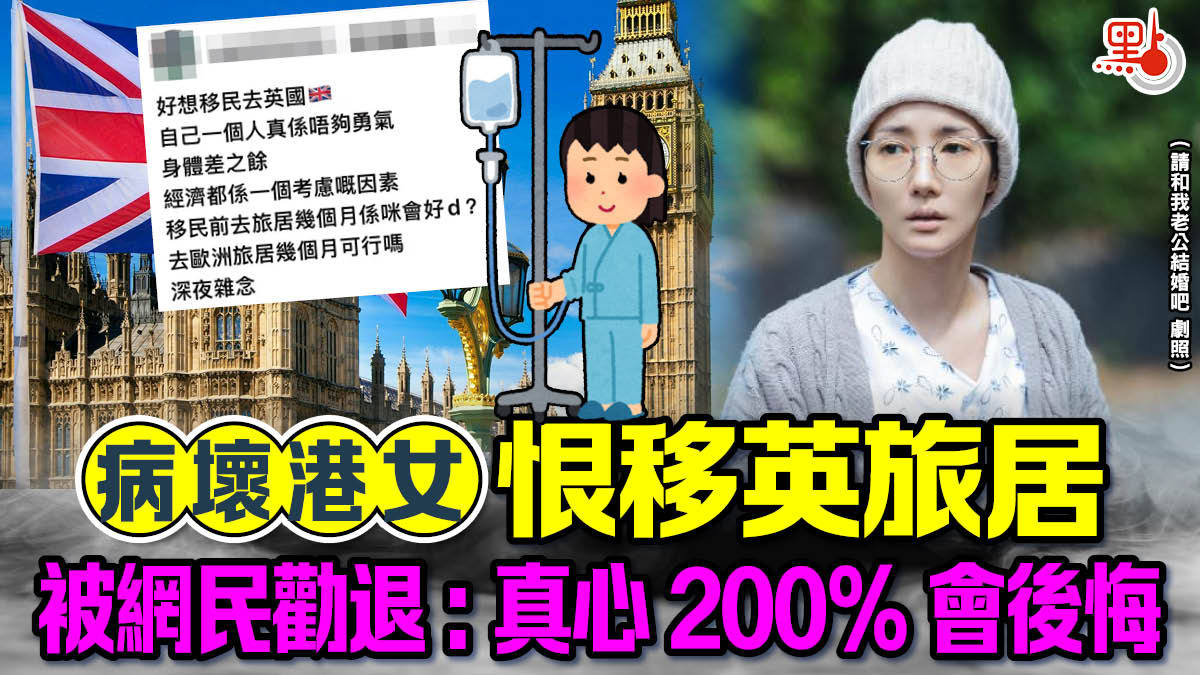【點新聞報道】話說不少港人跟風移民前,都沒有認真思考「自己係乜嘢新絲蘿蔔皮」。一名港女近日發文話好想移民去英國,但又自知身體差、經濟條件又唔好,所以想話先去旅居喎。結果被不少網民勸退,「旅居同真移民係兩回事」、「一個人真係唔去好過,如果無fd/親戚住附近真心200%會後悔」。