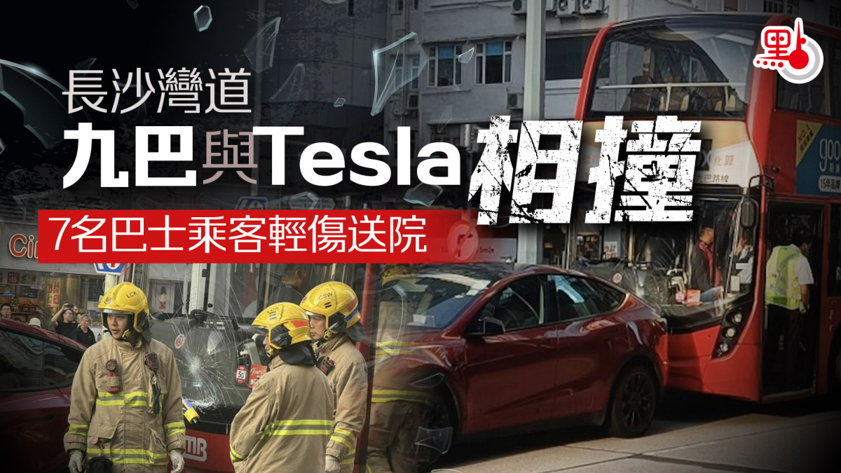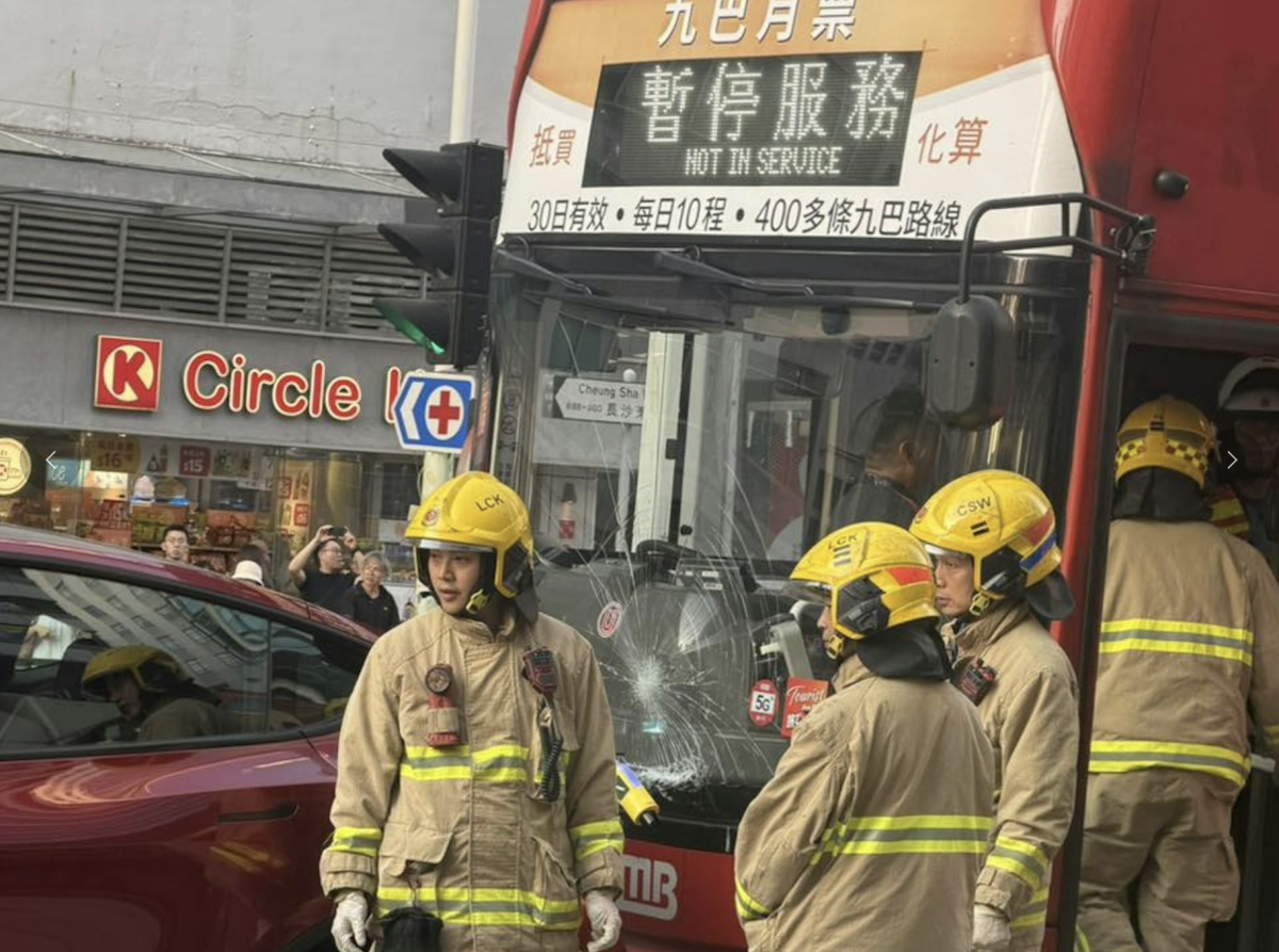 【點新聞報道】今日(8日)下午約4時,一輛駛往美孚方向的60X線九巴在駛至長沙灣廣埸對開時,與一輛紅色Tesla私家車相撞。意外造成至少7名巴士乘客受輕傷,被送往明愛醫院治療。現場可見,巴士的擋風玻璃破裂呈蜘蛛網狀,大批消防員及救護員到場協助救援。