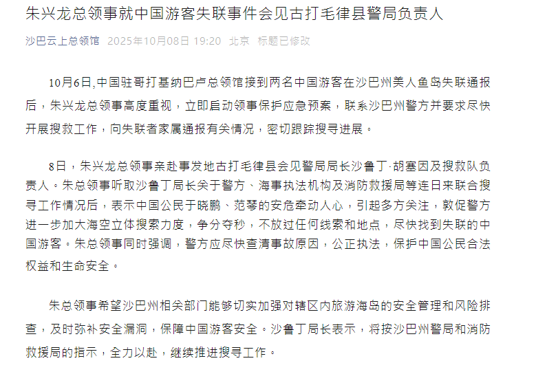 總領館指出,8日,朱興龍親赴事發地古打毛律縣會見警局局長沙魯丁·胡塞因及搜救隊負責人。朱興龍聽取沙魯丁局長關於警方、海事執法機構及消防救援局等連日來聯合搜尋工作情況後,表示中國公民于曉鵬、范琴的安危牽動人心,引起多方關注,敦促警方進一步加大海空立體搜索力度,爭分奪秒,不放過任何線索和地點,盡快找到失聯的中國遊客。朱興龍同時強調,警方應盡快查清事故原因,公正執法,保護中國公民合法權益和生命安全。