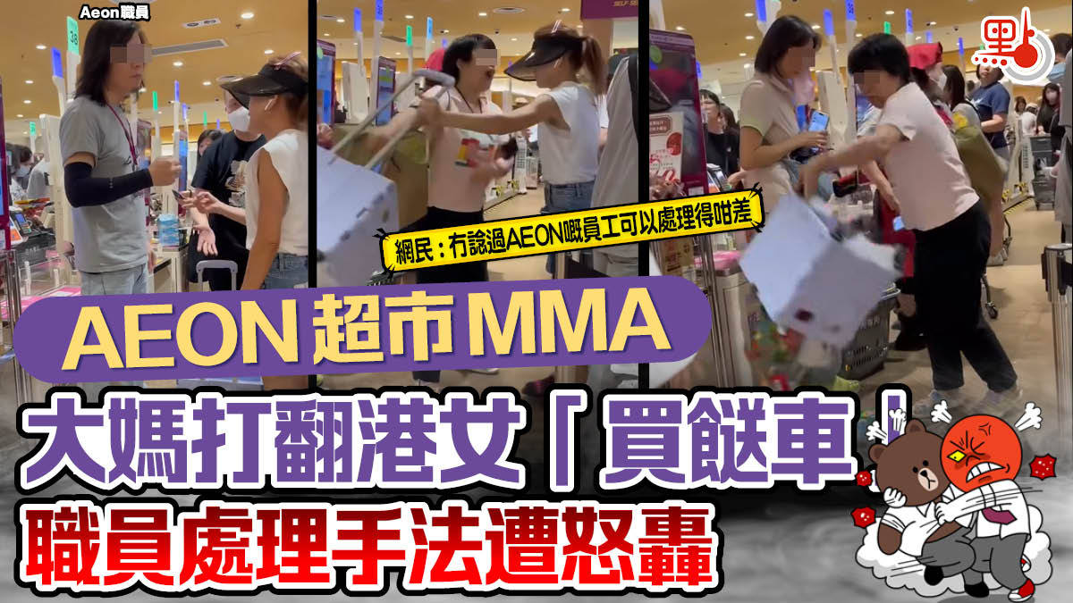 網上社交平台及多個社交群組昨日(8日) 瘋傳一段影片,可見在AEON超市的收銀處位置,有大媽與戴帽港女疑因碰撞而爭執,其間大媽把港女的「買餸車」推翻,令車內的貨物散落在地上。之後,港女上前理論,卻被大媽多次拍打、起腳、大力推開。港女就撿起「買餸車」往大媽推撞反擊,被大媽再次推開,並表示「你唔好咁樣,報警!」,又重複說「CCTV(閉路電視)你睇到未啊!」等。