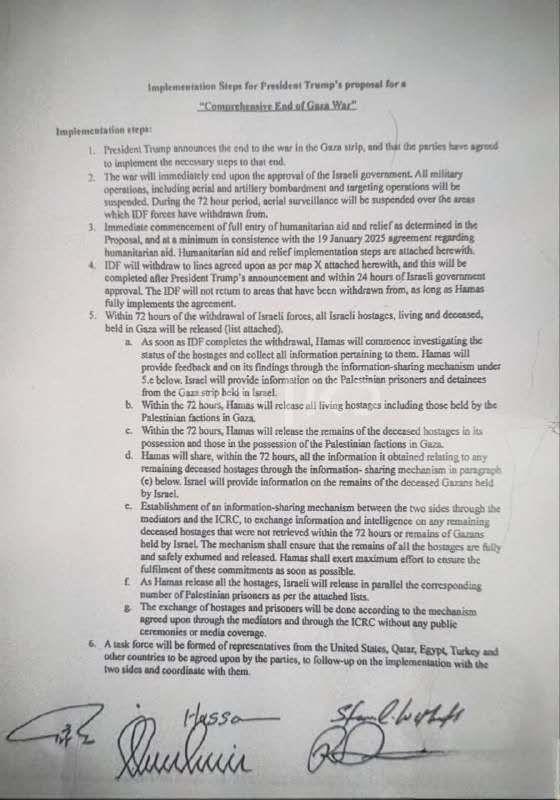 【點新聞報道】據央視新聞消息,以色列政府當地時間10日凌晨批准了加沙停火協議。9日夜間,以色列公共廣播公司Kan發布了以色列、哈馬斯和調解員在埃及簽署的釋放被扣押人員和結束加沙衝突的協議副本。這份文件詳細介紹了該協議的各個部分: