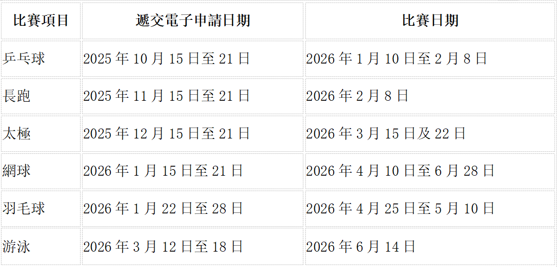 有意參加的市民可透過SmartPLAY康體通遞交電子抽籤申請。如抽籤後仍有餘額,市民可於各比賽項目的公開報名階段重新報名,名額先到先得。詳細資訊載於專題網頁。