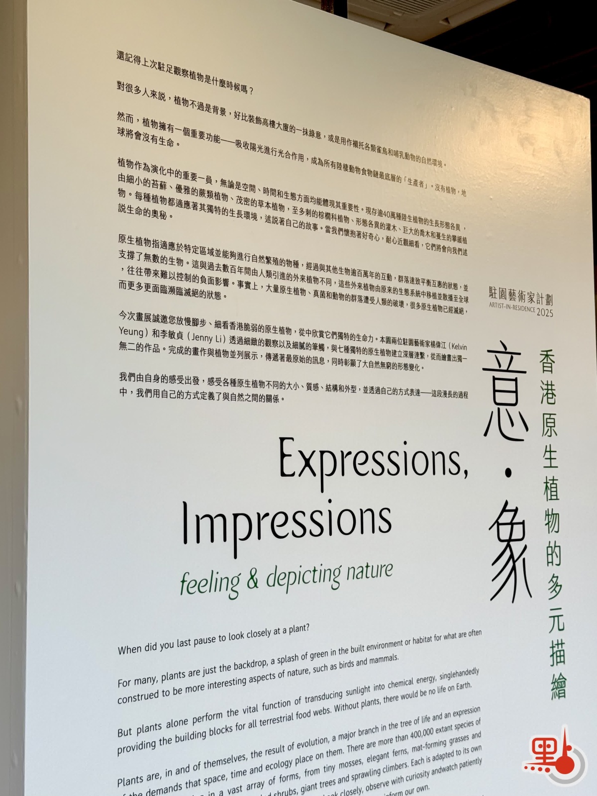 嘉道理本年度駐園藝術家李敏貞與楊偉江,以藝術作品呈現七種具代表性的香港原生植物,並創新性地將植物畫作與植物本體一同展出,供觀眾細緻觀察每種植物及其藝術映像,亦透過植物保育與藝術創作的巧妙結合,喚起公眾對本土生態的關注。