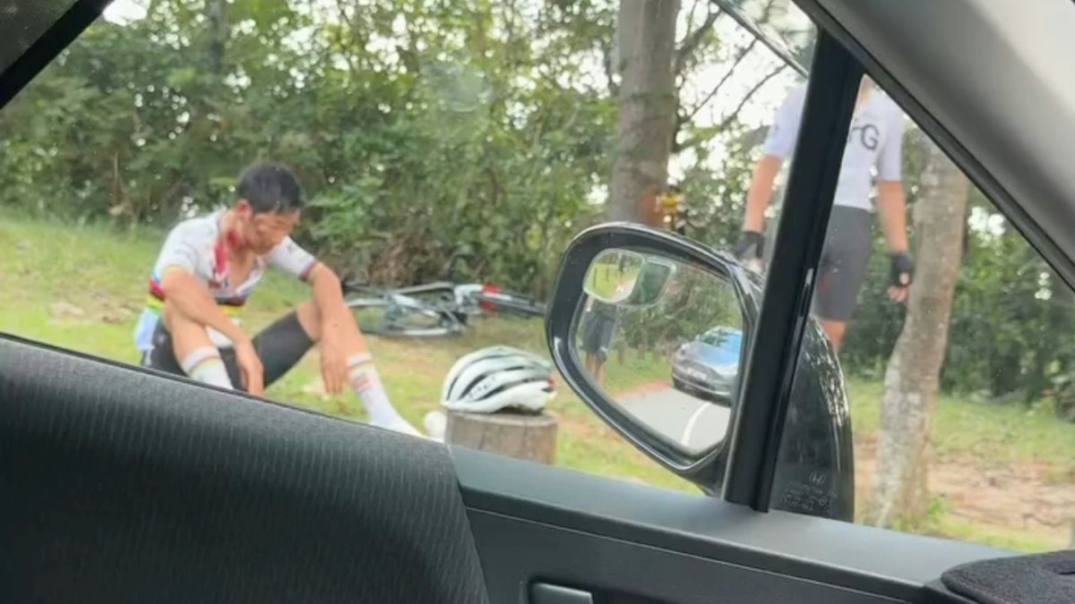 【點新聞報道】今日(10日)下午約2時33分,一輛私家車疑在大帽山道近扶輪公園對開處與兩輛單車相撞,造成兩人受傷。現場照片可見,其中一名單車男騎手疑似頸部有傷口,上衣染血,他將頭盔放在路邊樹墩上,坐地等待救援。