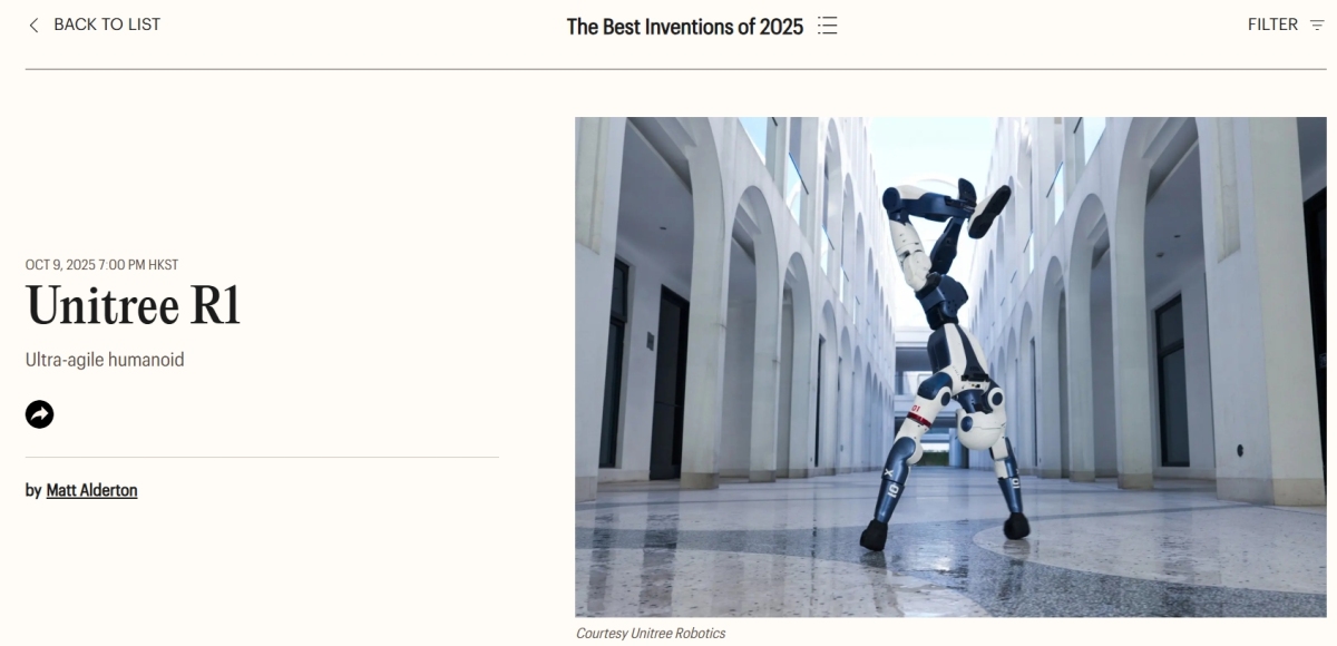 在機械人領域,宇樹科技的Unitree R1人形雙足機械人入選。《時代》稱,從無人機到自動駕駛汽車,如今的大多數機械人並不是科幻作品中設想的人形機械人,而宇樹科技的R1則屬於例外。該人形機械人共有26個關節(人類有300個),使其能夠完成複雜動作,如拳擊、跑步,甚至翻筋斗,令觀眾驚嘆不已。