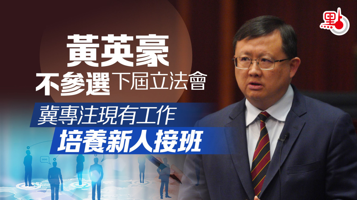 【點新聞報道】現任立法會(進出口界)議員黃英豪今日(11日)表示,由於需要集中精力做好港區全國人大代表、浸會大學校董會主席等工作,以及支持培養界別內傑出青年俊傑參選,他決定不參加即將舉行的第八屆立法會選舉。