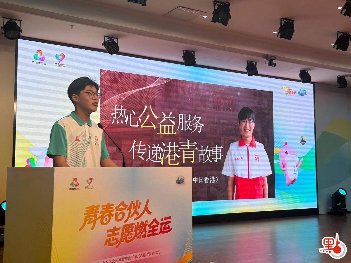 來自暨南大學的香港志願者楊竣傑接受記者採訪時表示,早前參與了殘特奧會乒乓球比賽的賽事服務,下月則將投入開幕式志願工作,「可以在大灣區的體育盛事中出一份力,真的很開心。」