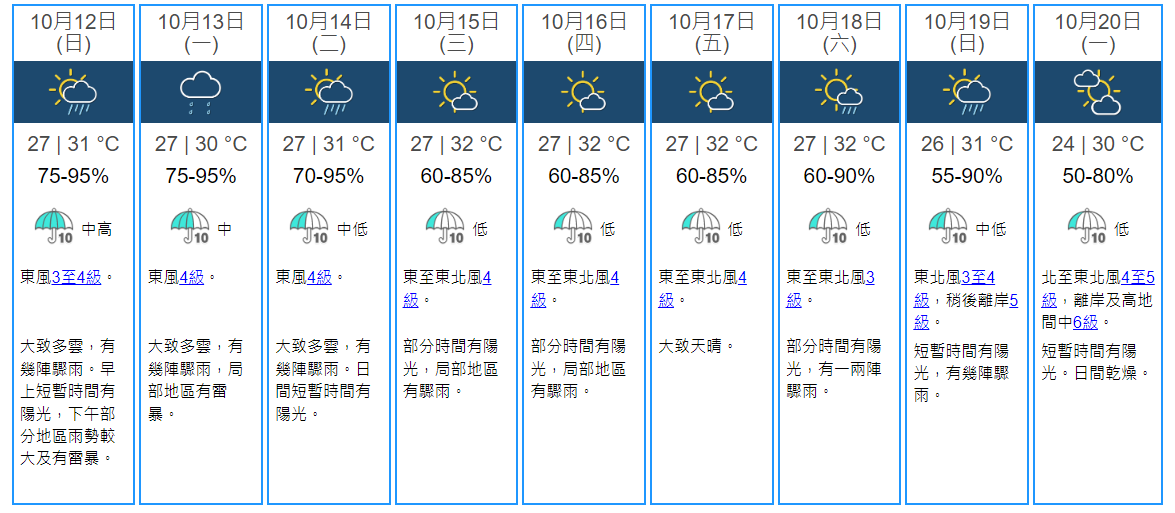 天文台預測本港地區今日天氣大致多雲,有幾陣驟雨,早上短暫時間有陽光,下午部分地區雨勢較大及有雷暴,最高氣溫約31度,吹和緩偏東風。展望未來一兩日仍有幾陣驟雨,本周中後期天色好轉。