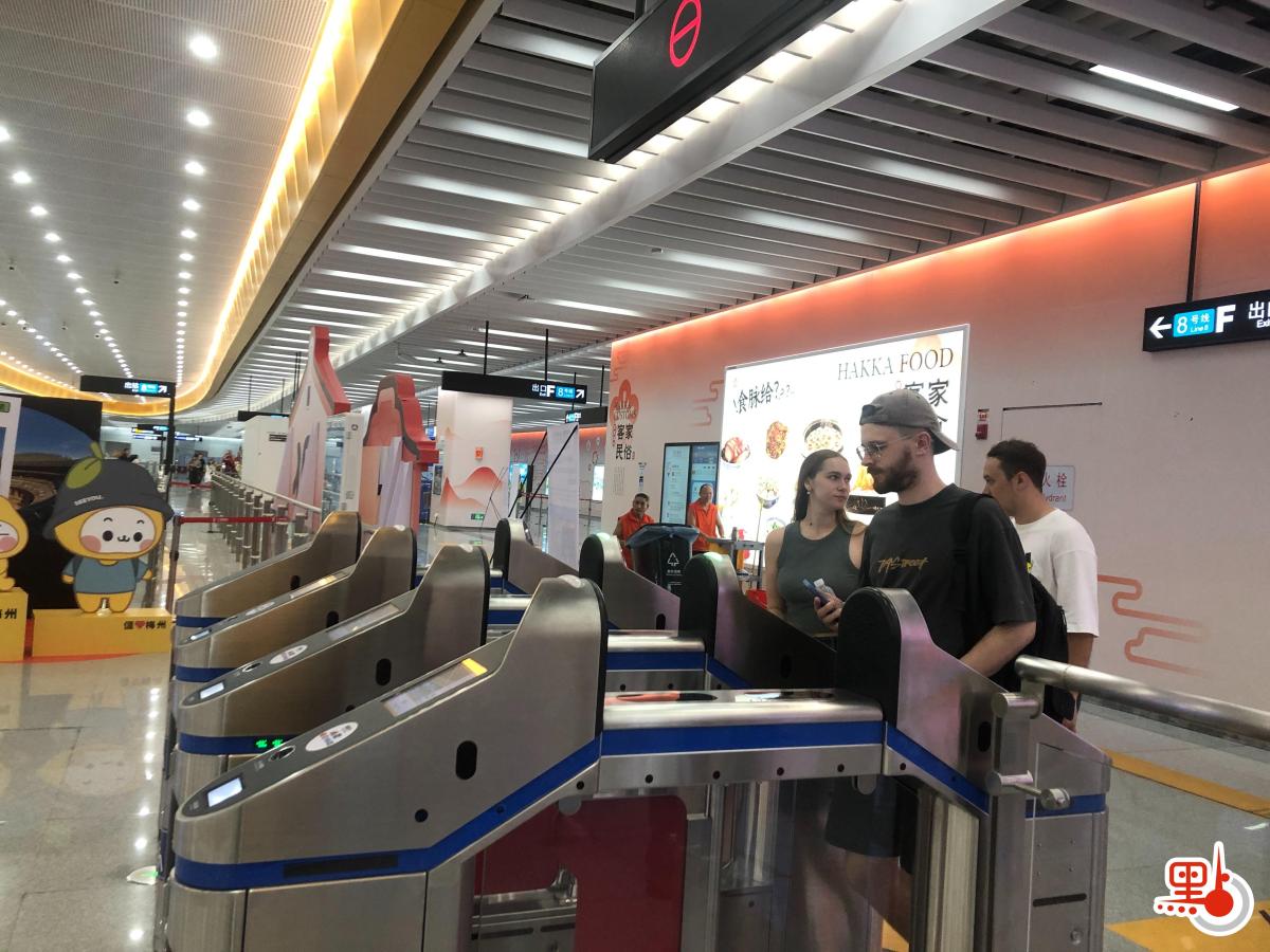 點新聞記者12日在廣州地鐵不同站點看到,部分閘機旁邊設有指引牌,以中英文標出「歡迎使用上述銀行卡『拍卡過閘』」。同時,在閘機「拍卡」感應區域上也有不同標識,讓境外旅客一目了然。