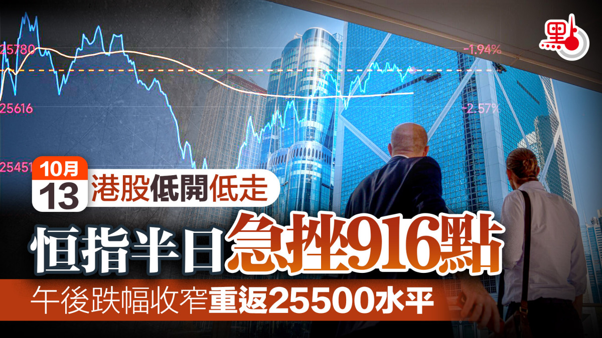 【點新聞報道】美國總統特朗普上周五(10日)威脅稱會對中國加徵100%關稅,拖累已連跌5日的港股進一步尋底。恒生指數今(13日)早裂口低開656點或2.5%,報25634點。早段跌幅一度收窄至407點,惟其後走勢再度向下,半日大跌916點。下午開市後初段跌幅稍為收窄,返上25500水平,較早前報25672點,跌618點。