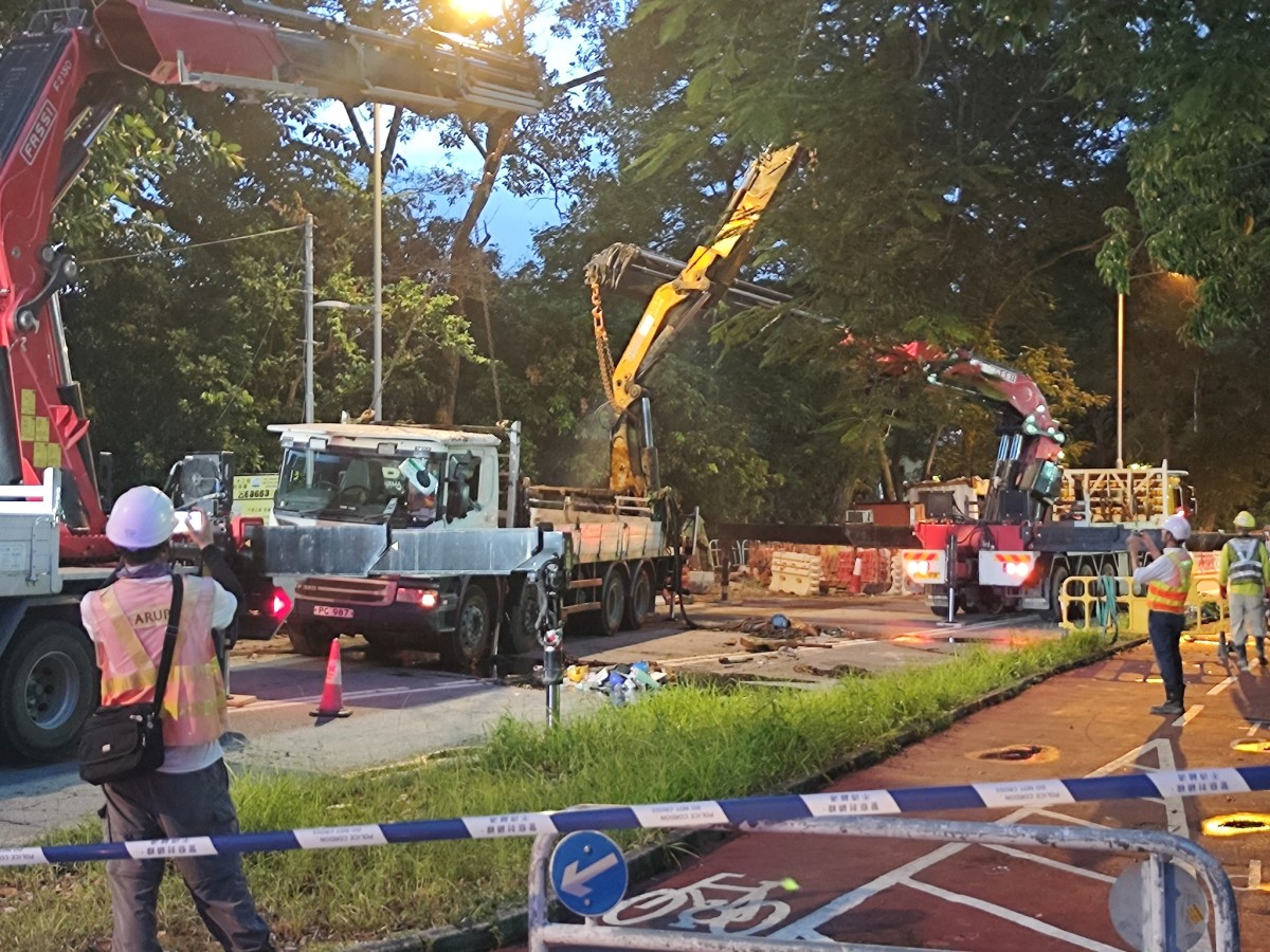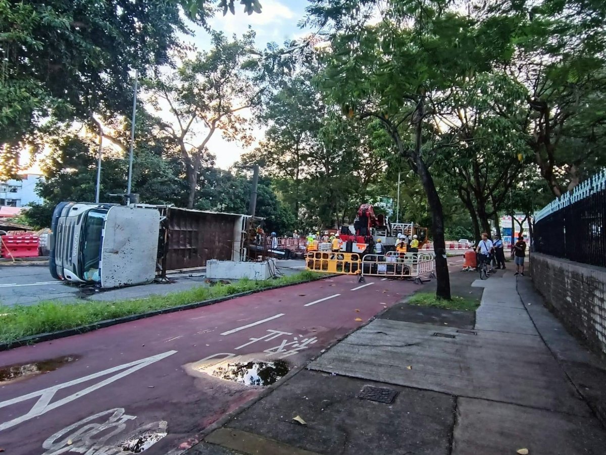 【點新聞報道】今日(13日)下午4時40分,一輛吊臂車在鳳池路、博愛醫院鄧佩瓊紀念中學對開處失事翻側。現場圖片可見,數輛吊臂車停在路邊,涉事吊臂車翻側於馬路中間,吊臂橫亘於單車徑。