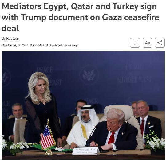 【點新聞報道】據中新社援引路透社報道,當地時間13日,美國總統特朗普在埃及沙姆沙伊赫,與埃及、卡塔爾和土耳其三國領導人共同簽署了關於加沙停火協議的文件。