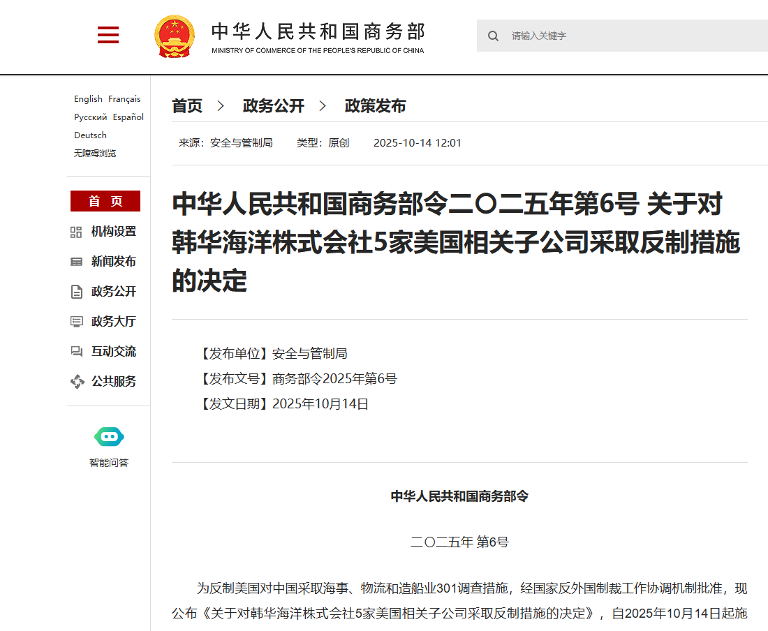 【點新聞報道】據商務部官方網站今日(14日)公告,為反制美國對中國採取海事、物流和造船業301調查措施,經國家反外國制裁工作協調機制批准,現公布《關於對韓華海洋株式會社5家美國相關子公司採取反制措施的決定》,自2025年10月14日起施行。
