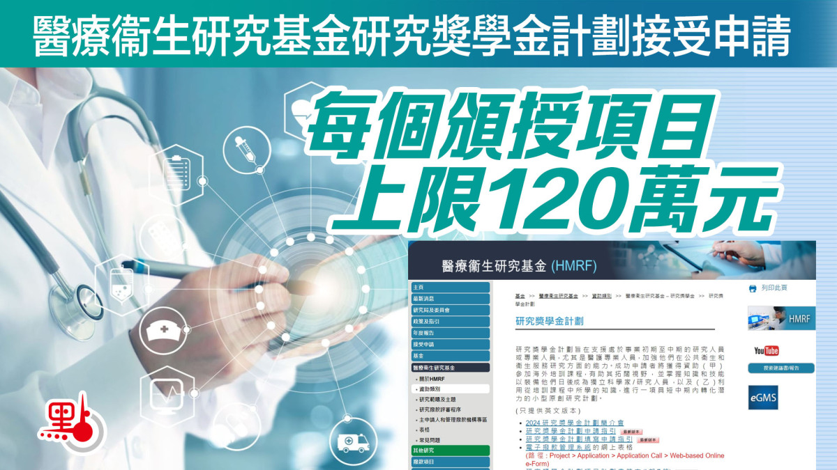 【點新聞報道】醫務衞生局今日(14日)邀請有興趣人士申請醫療衞生研究基金的研究獎學金計劃。計劃旨在支援處於事業初期至中期的研究人員或專業人員,尤其是醫護專業人員,加強他們在公共衞生和衞生服務研究方面的能力。