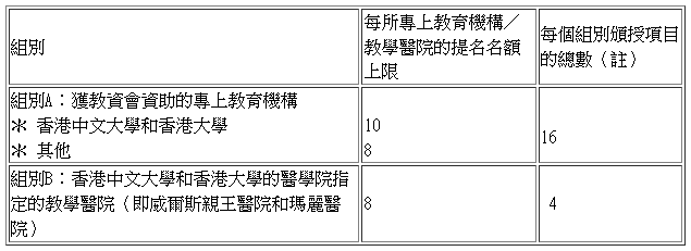 每個頒授項目的獎學金上限為120萬元,當中40萬元用以資助申請人接受非本地進行的培訓。獲大學教育資助委員會(教資會)資助的專上教育機構,以及香港中文大學和香港大學的醫學院指定的教學醫院(即威爾斯親王醫院和瑪麗醫院)會獲邀提名申請人,提名名額和頒授項目數目詳見下表: